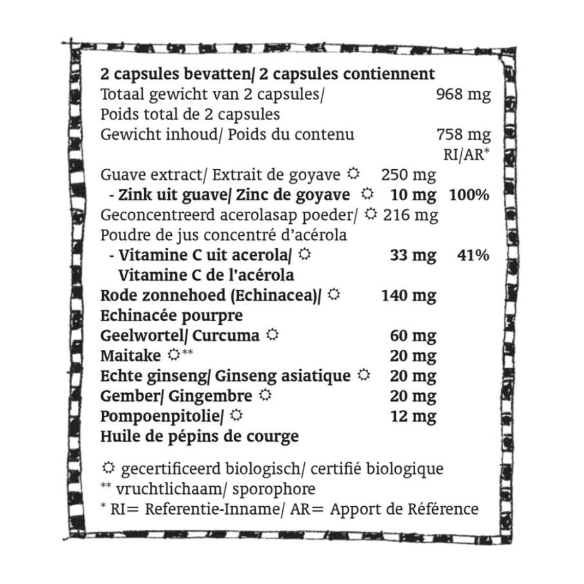 Guave extract*, Acerola poeder*, Hydroxypropylmethylcellulose (capsule), Echinacea, Geelwortel* Arabische gom* (verdikkingsmiddel), Panax ginseng), Maitake*, Gember* Pompoenpitolie*.
